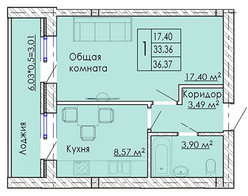 В наличии еще планировка 35,98 кв .м.